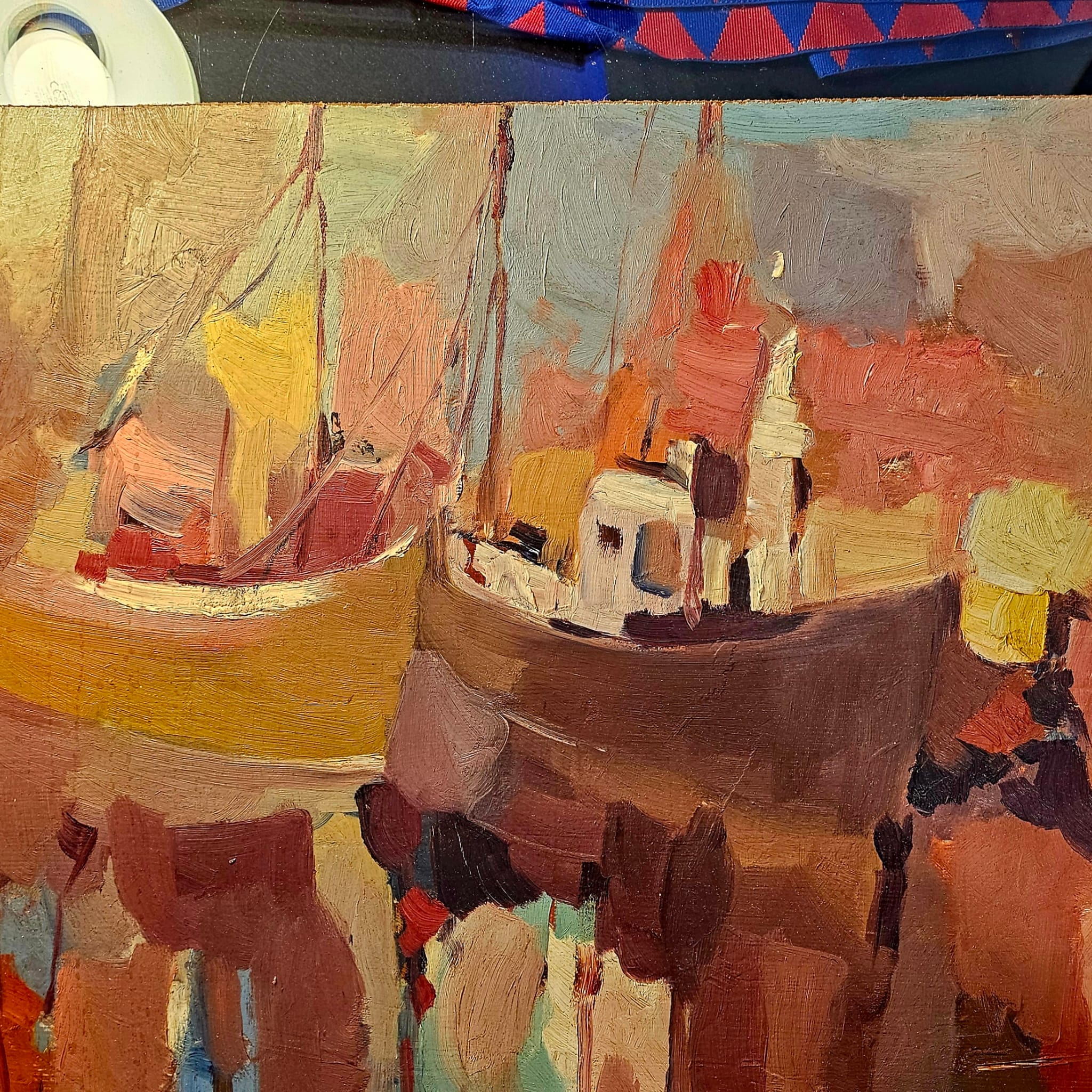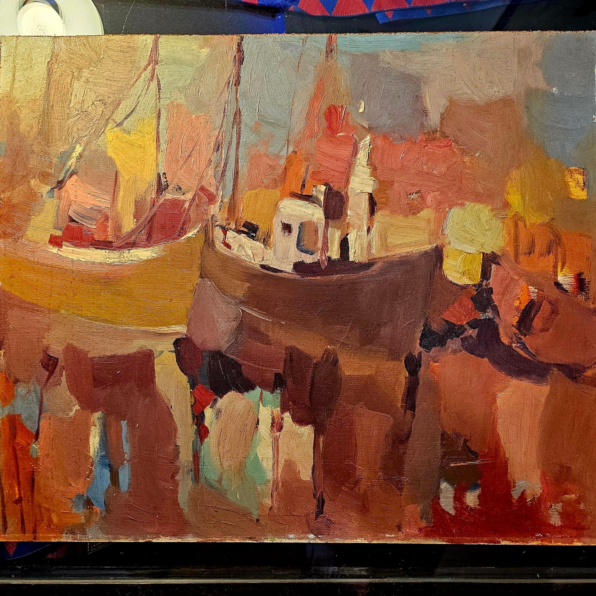 The boats seem to float in a space made of colour and emotion, amid burnt earth tones, vibrant reds, and golden yellows dissolving in watery reflections. Everything pulses with life and, at the same time, with a magical stillness. Her gesture is loose but precise β as if she intimately knows what she paints, yet chooses to reinvent it with freedom.