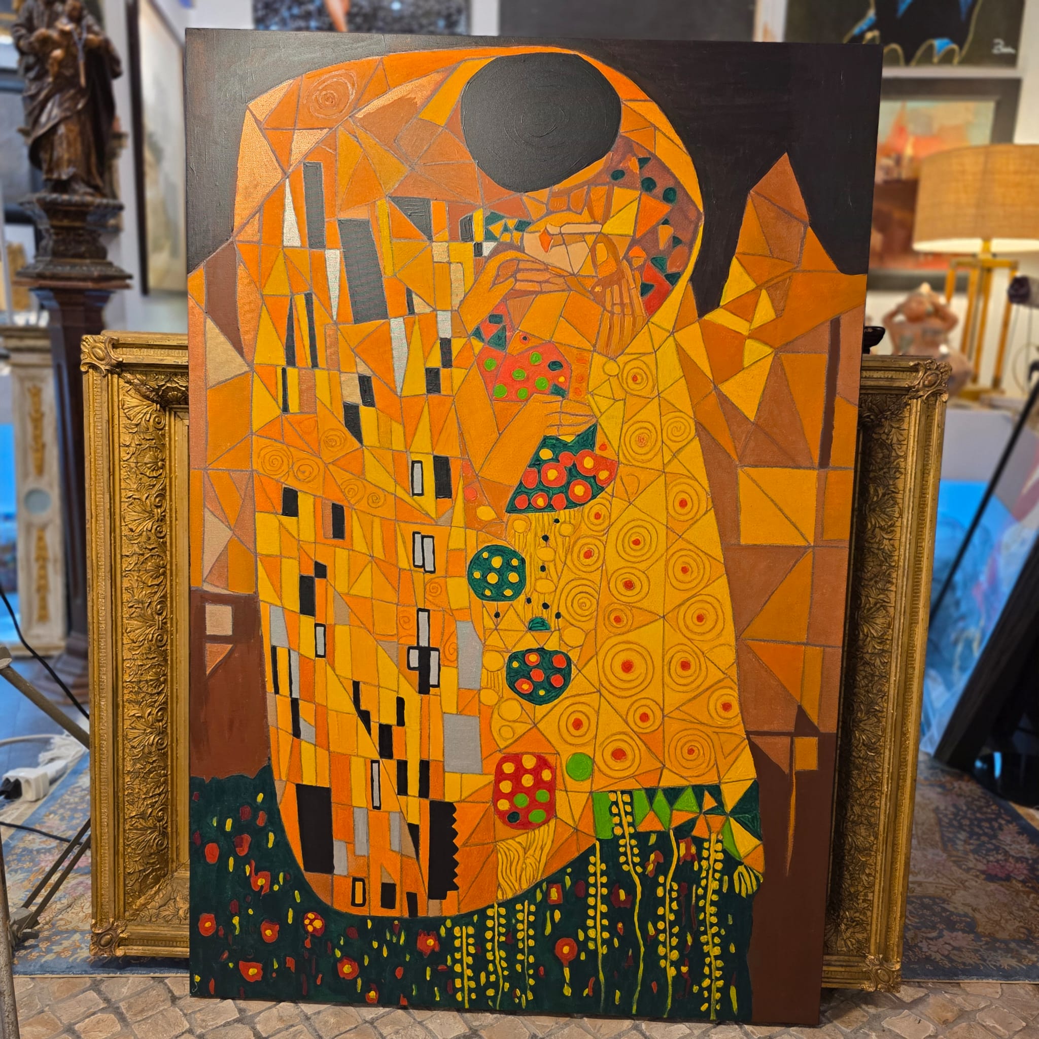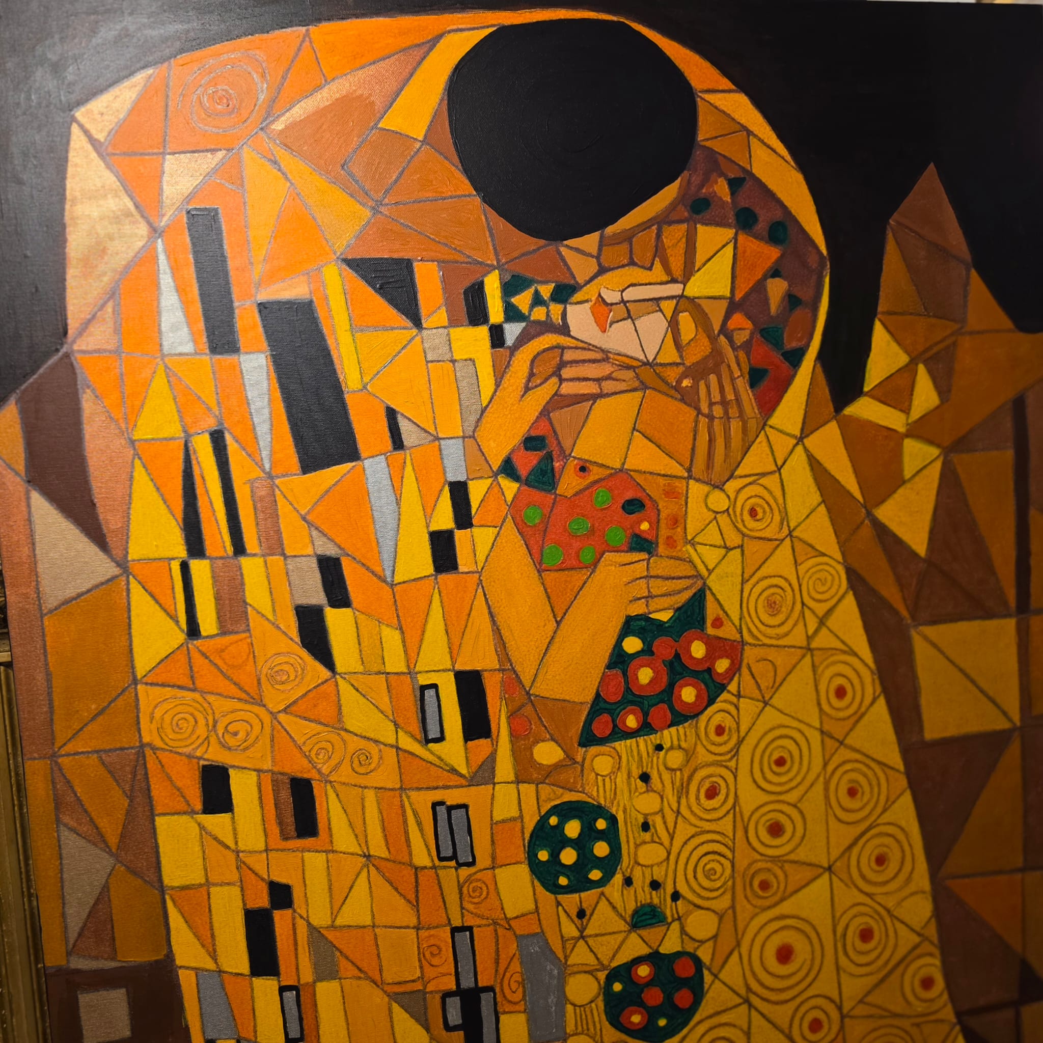 I speak from inside the painting, with a critic’s eye: this work is a direct dialogue with Klimt’s golden legacy, filtered through my grammar of faceted planes, an almost-musical rhythm, and a mosaic of geometries that at times reveal and at times conceal. Gold opens into fields of amber, ochre, and honey, crossed by blacks and greys that create breaths and pauses; circles, spirals, and rectangles compose a visual score where the kiss happens—contained, inevitable, almost liturgical. 💛🎼