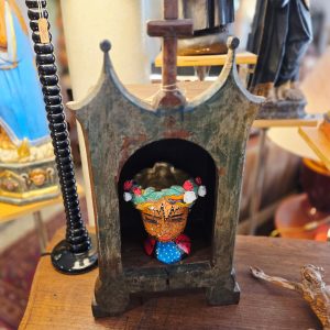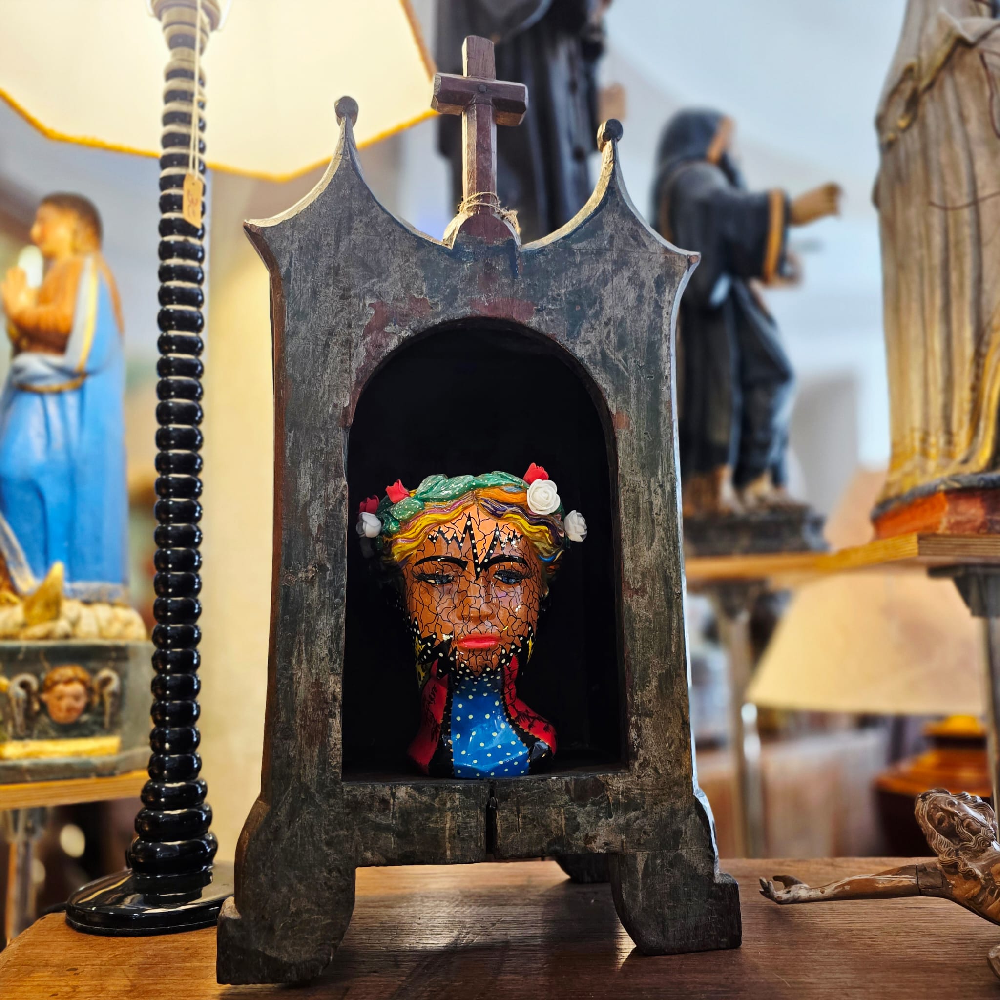 Today it houses a contemporary head-vase that gives it a poetic wink: a happy dialogue between folk devotion and today’s creativity. The contrast is vibrant and turns this piece into a statement with soul and character.