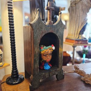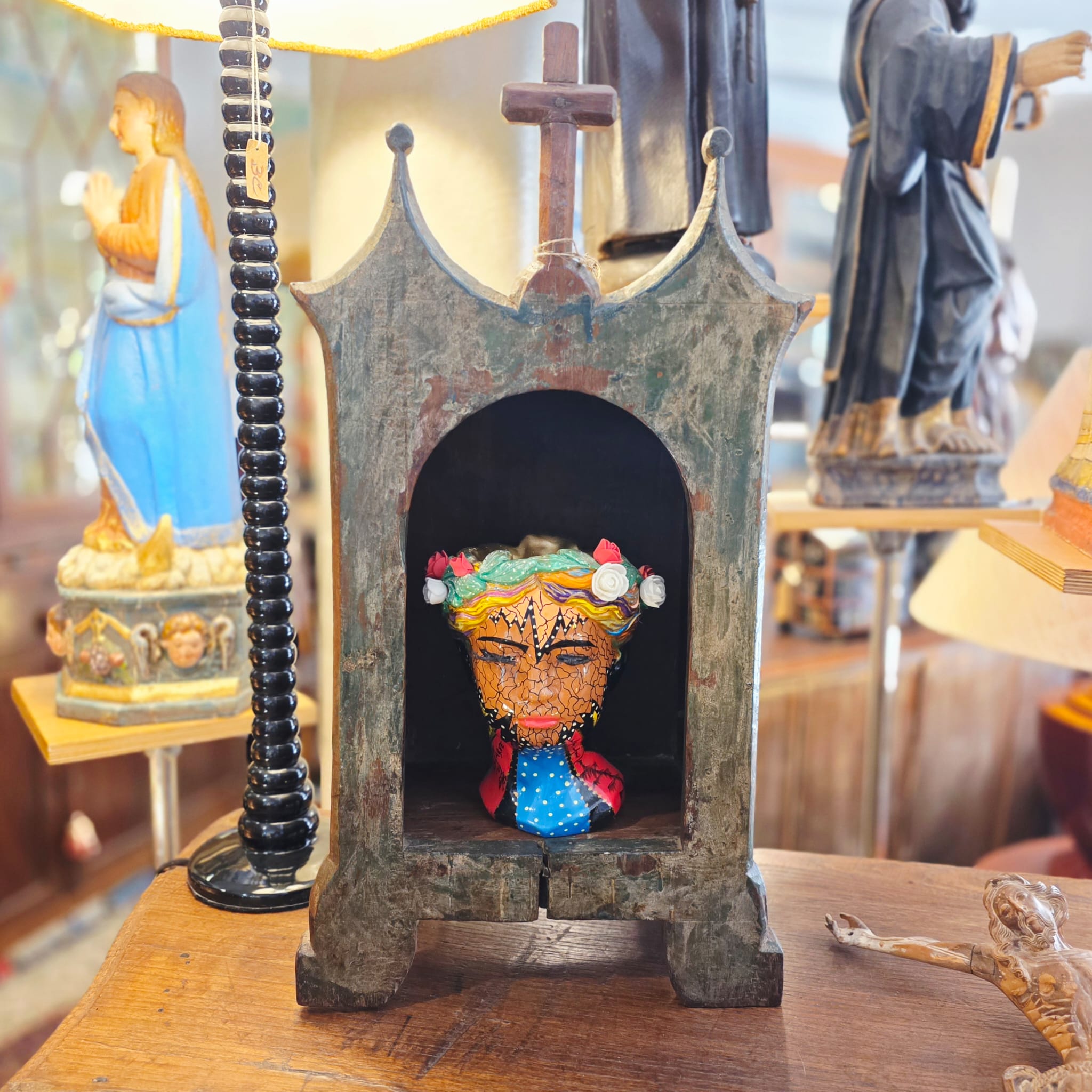This little folk treasure stole my heart. It’s a domestic wooden oratory, with pinnacles and a cross on top, an arched niche, and an absolutely irresistible old patina — the kind only time, devotional use, and family hands can create.